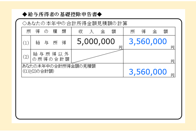 給与収入が5,000,000円の場合、給与所得は3,560,000円となります。