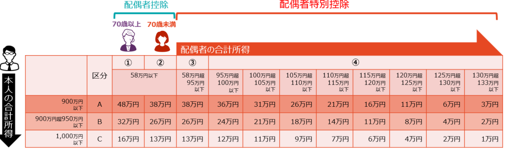 - 控除額は、納税者本人と配偶者の合計所得金額で異なり、最高で38万円です。
