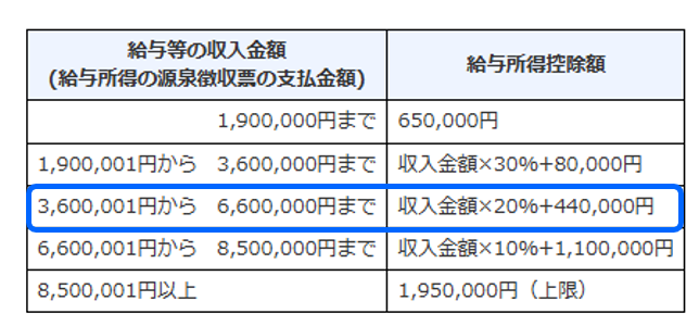 まず、給与所得控除の表を使って給与所得控除額を算出します。