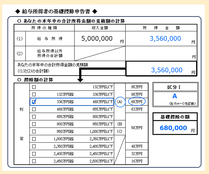 基礎控除申告書では、給与の収入金額から所得を求め、基礎控除額を算出します。