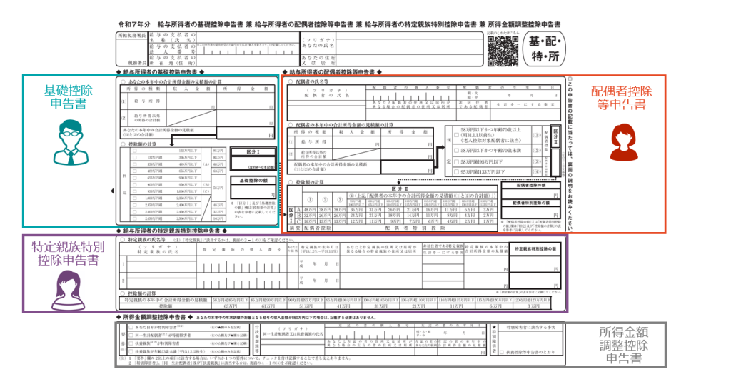 年末調整で提出する「基礎控除申告書兼配偶者控除等申告書兼特定親族特別控除申告書兼所得金額調整控除申告書」は、4つの控除を1枚で申告できる重要な書類です。