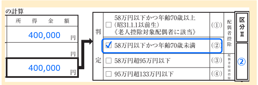 配偶者控除等申告書では、配偶者の所得を求め、配偶者控除と配偶者特別控除のいずれが適用できるか、控除額はいくらになるかを算定します。