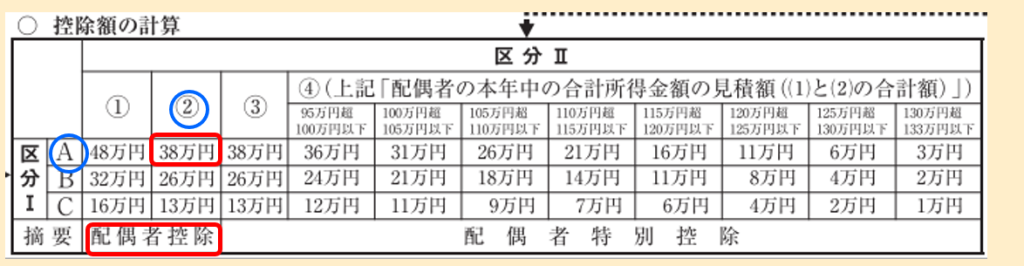 控除額は本人と配偶者の合計所得によって細かく変わるため、区分表を確認しましょう。
