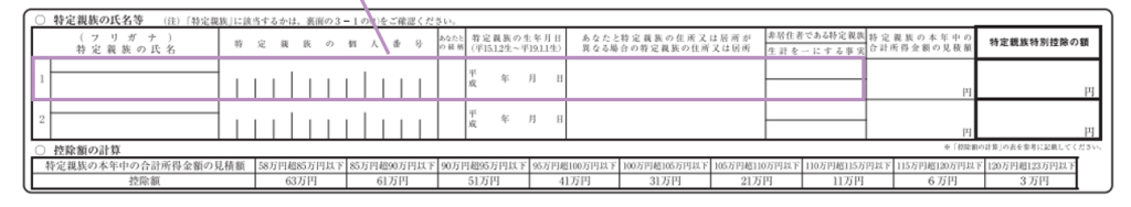特定親族特別控除申告書では、特定親族の情報の記入と控除額を算出します。