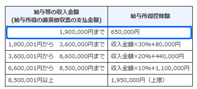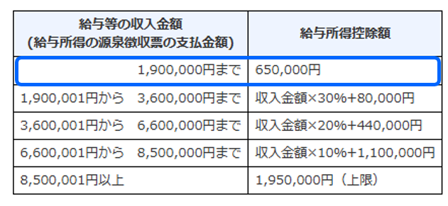 例えば給与収入が1,050,000円の場合の給与所得控除額 は650,000円です。