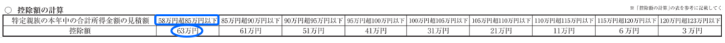 さらに、令和7年分から始まる特定親族特別控除では、対象となる親族の所得を算出し、該当する控除額を表から判断します。