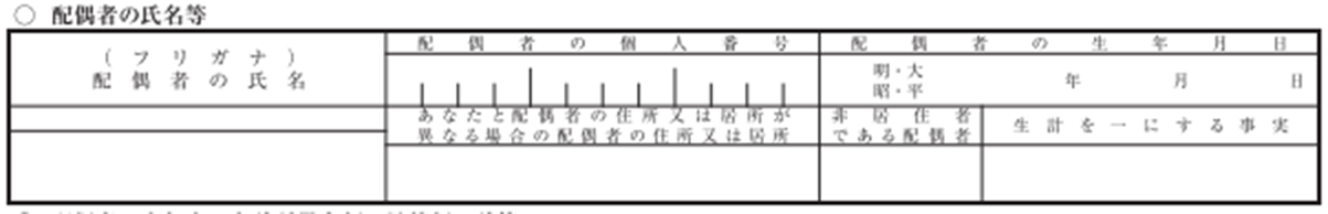 記入にあたっては、まず配偶者の氏名・続柄・個人番号・生年月日・住所を記入します。