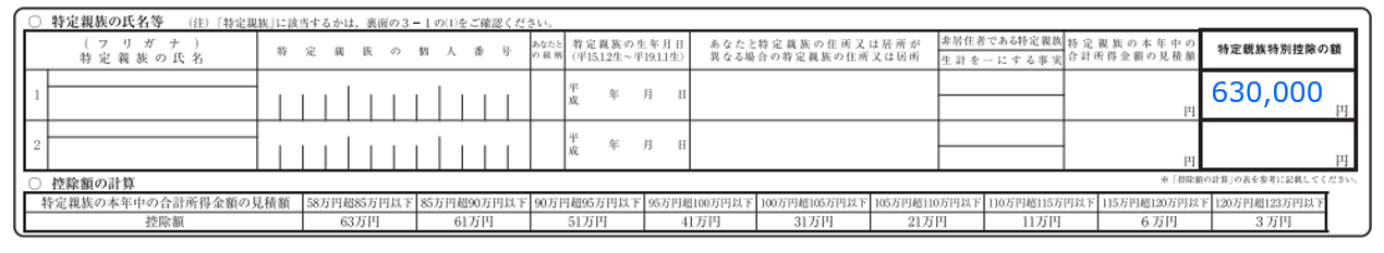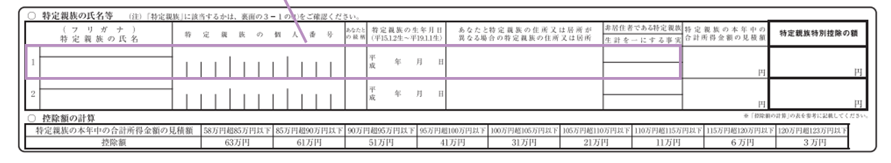 特定親族特別控除申告書では、特定親族の情報の記入と控除額を算出します。