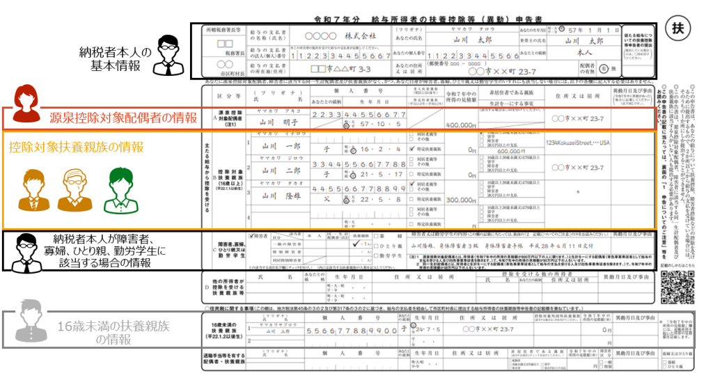 申告書の記入は、本人の基本情報に始まり、源泉控除対象配偶者、控除対象扶養親族、各種控除該当者、16歳未満の扶養親族という5つのステップで構成されています。扶養控除のうち、19歳以上23歳未満の特定扶養親族には63万円、70歳以上の同居老親等には58万円という高額な控除が適用されます。