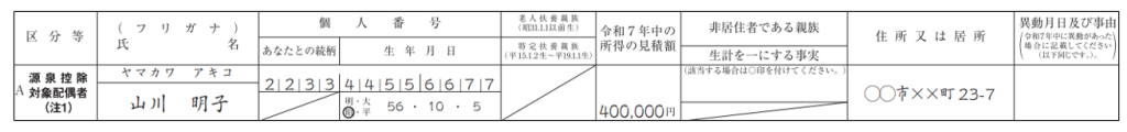 源泉控除対象配偶者に該当する場合、配偶者の氏名・個人番号・生年月日・住所・所得の見積額を記入します。