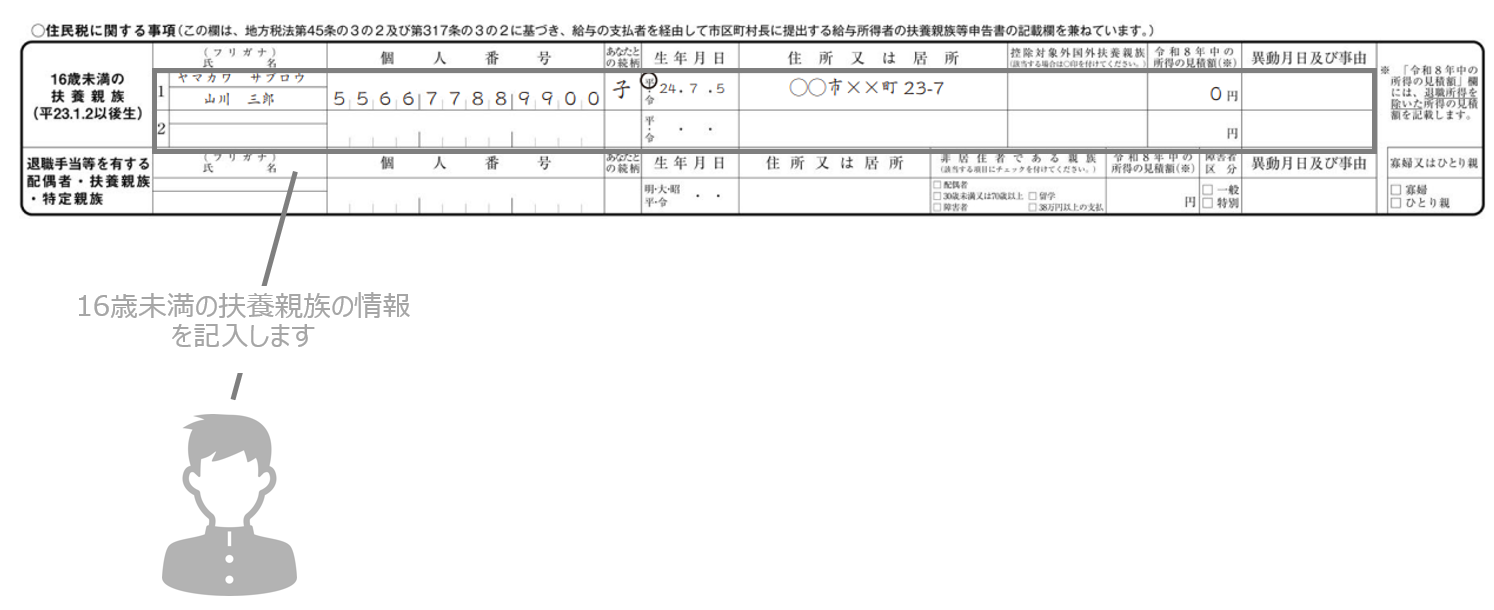 16歳未満の扶養親族は所得税控除の対象外ですが、住民税計算や児童手当のために記入が必要です。