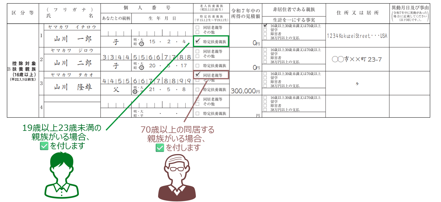 扶養親族が以下に該当する場合には、それぞれ所定の箇所にチェックマークを付します。