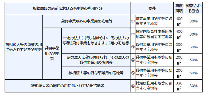 出典:国税庁 No.4124 相続した事業の用や居住の用の宅地等の価額の特例(小規模宅地等の特例)