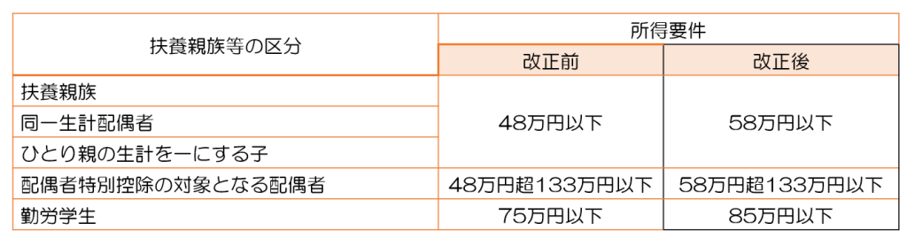 基礎控除の引上げに伴い、扶養控除や同一生計配偶者の所得要件も、合計所得金額58万円以下へと引き上げられました。