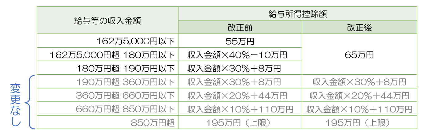 給与所得控除の最低保障額が、55万円から65万円へ引き上げられました。