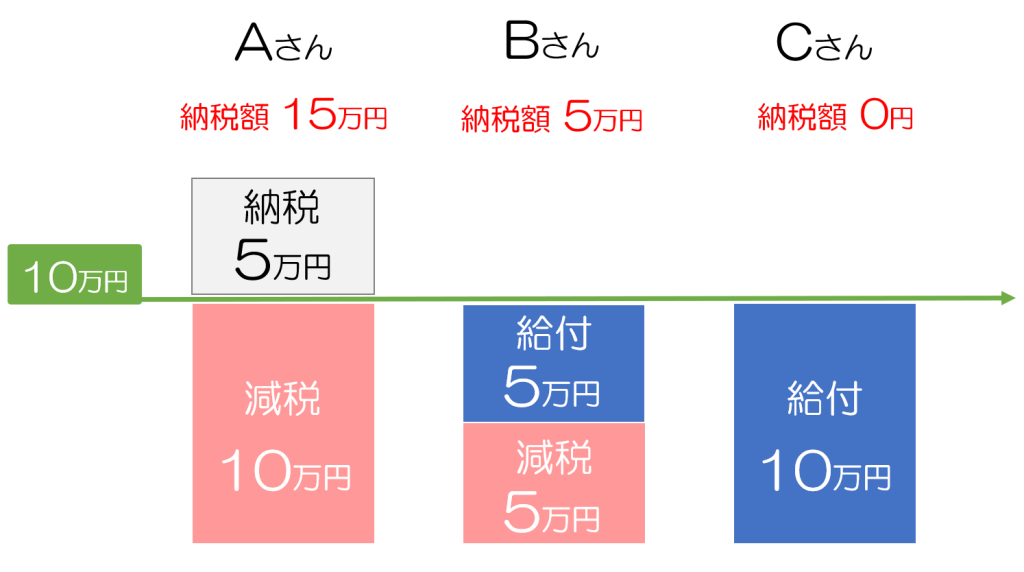 10万円の給付付き税額控除が行われると仮定した場合、所得税納税額が①Aさん:15万円、②Bさん:5万円、③Cさん:0円とすると納税額と減税額、給付額は以下のようになります。